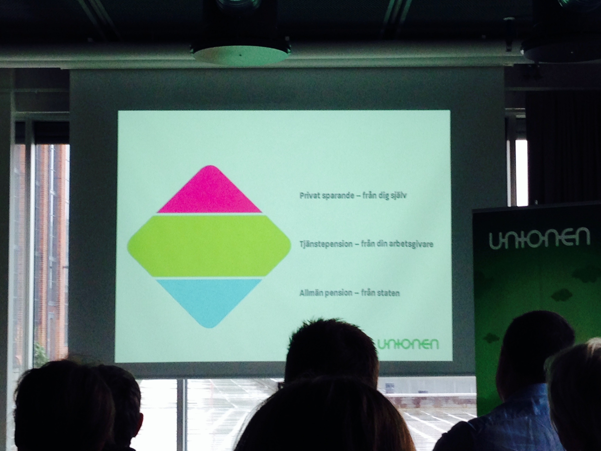 Inledde gjorde Unionen som är Sveriges största fackförbund, och världens största fackliga organisation. Fokus för deras dragning var vikten av kollektivavtal och den sökandes makt att få veta vilka villkor och spelregler som finns på arbetsplatsen. En viktig punkt handlar om pensionen och Unionens representant menade att den traditionella pensionspyramiden som signalerar att den största andelen kommer från staten kanske är i behov av att ritas om enligt modellen på fotot nedan. Tjänstepensionen spelar en stor roll för den slutliga pensionen och där kan ett kollektivavtal ge trygghet. Dessutom är det ineffektivt med konflikter på arbetsplatsen vilket undviks oftare om premisserna är tydliga.